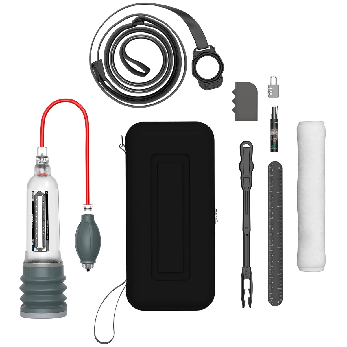 INBEGREPEN: Penispomp, opbergdoos, handpomp met slang, extra ring, doucheriem, reinigingsspons, meetlint, hangslot, monster glijmiddel en een Bathmate-handdoek.