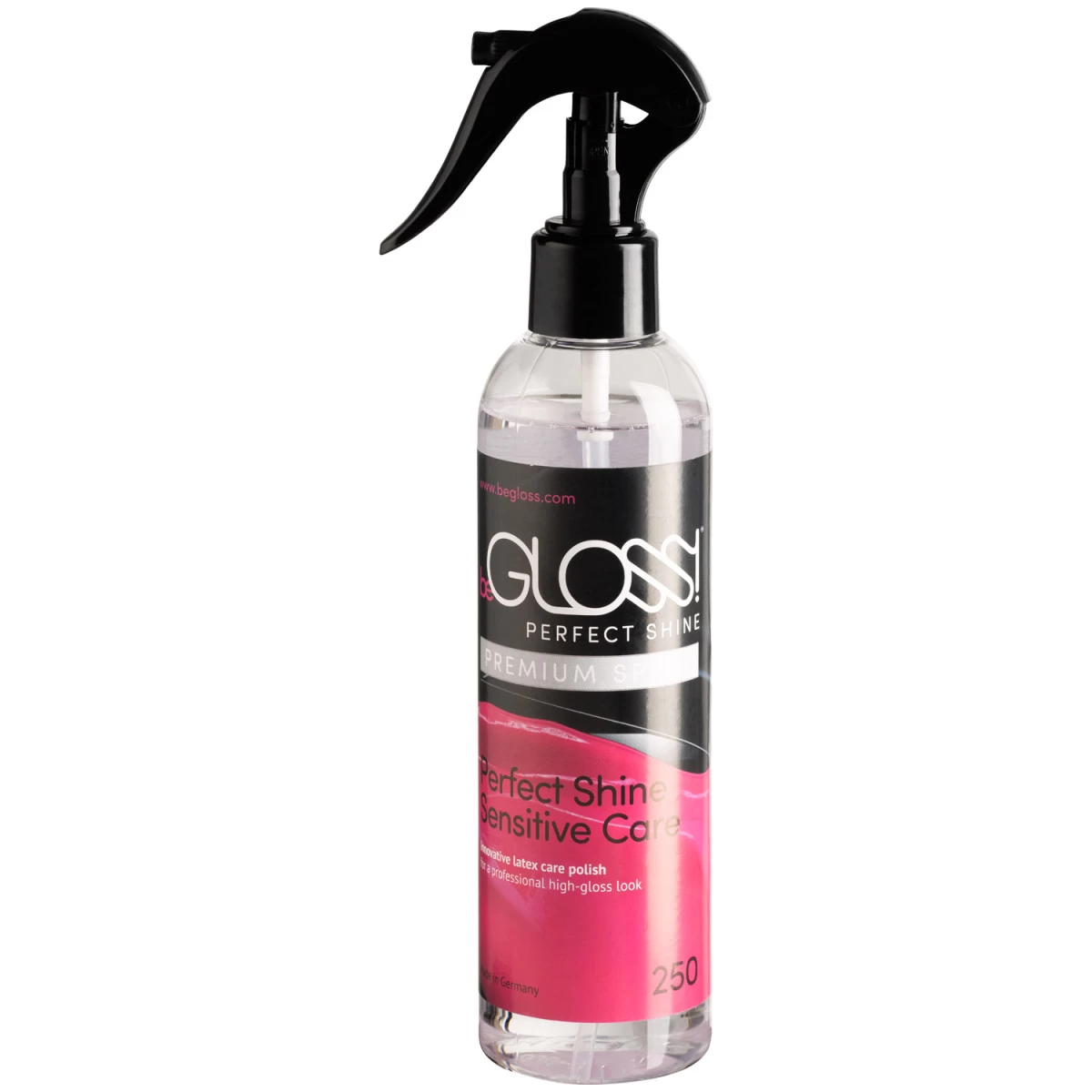 Verwen je fetish outfit met Perfect Shine Premium Spray van beGLOSS, die verzorgt en beschermt en tegelijkertijd een langdurige glans geeft.