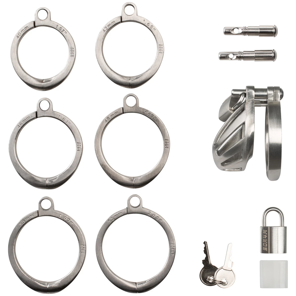 De robuuste kuisheidskooi bestaat uit een peniskooi, 7 basisringen in verschillende maten, 2 spacers, 3 borgpennen en een hangslot met 2 sleutels. Kies de best passende basisring en monteer de rest van het apparaat zodat het overeenkomt met de afmetingen van jouw sub. Zodra het slot vastklikt, ziet het eindresultaat er niet alleen fantastisch kinky uit, maar het voorkomt dat de penis eruit kan gaan.