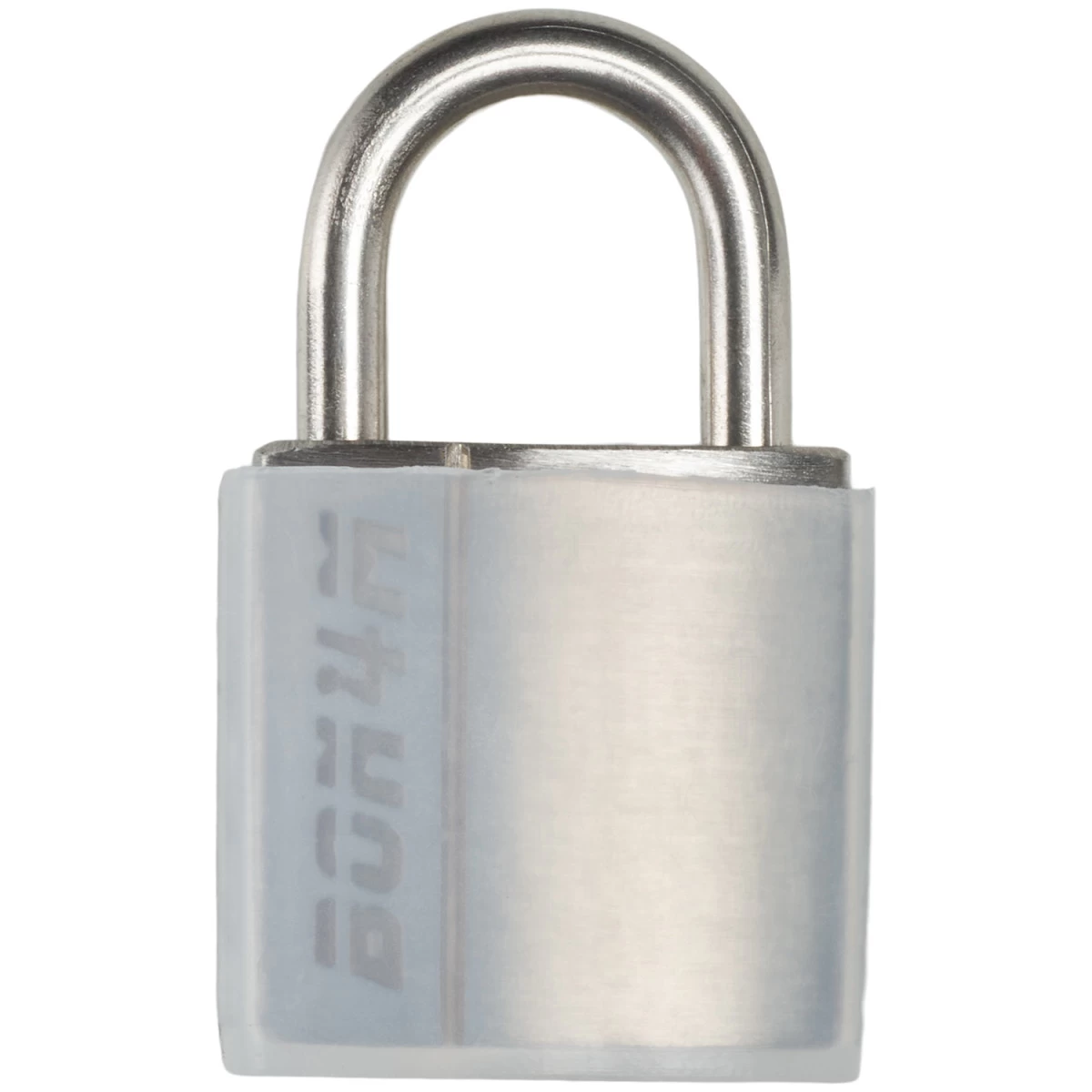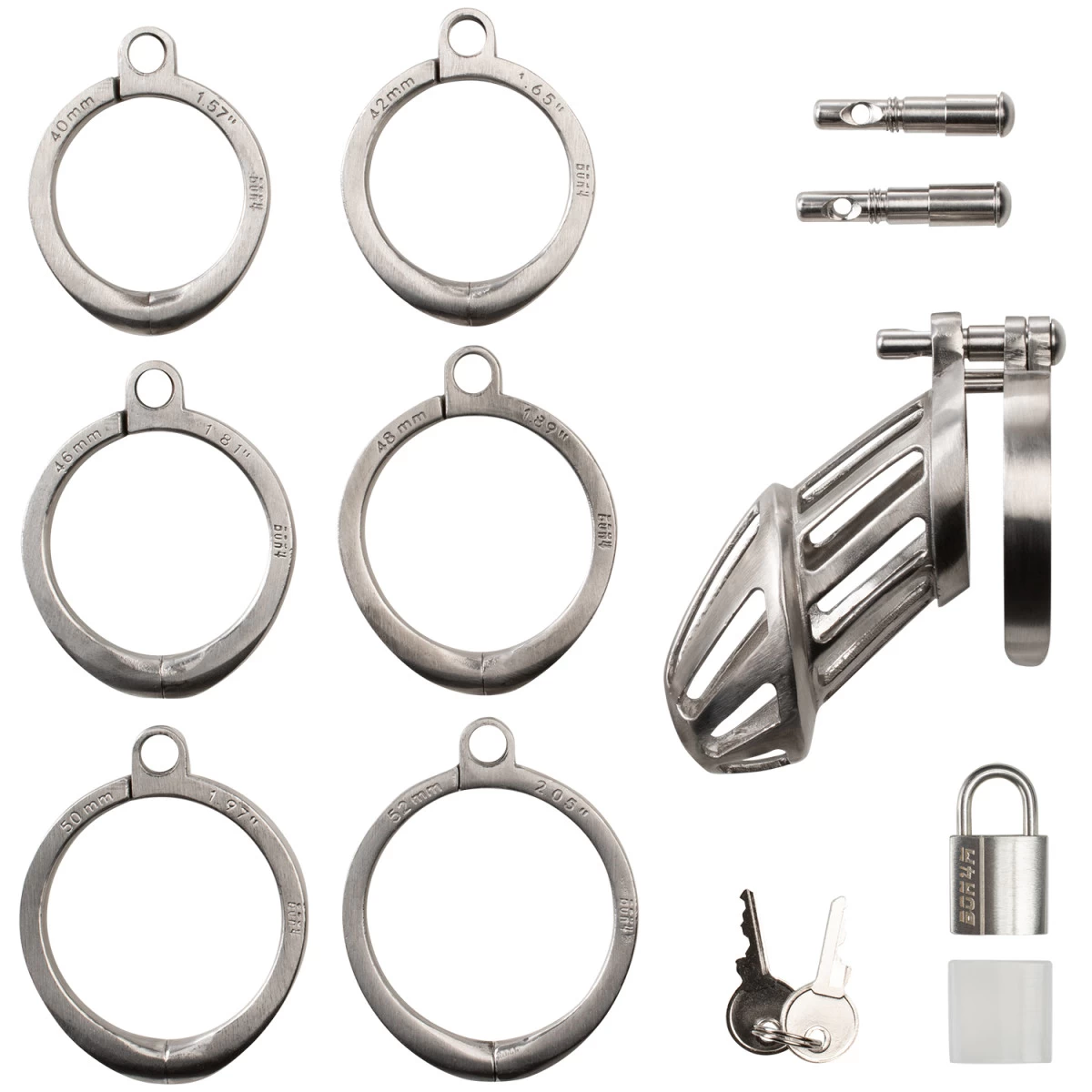 OMVAT: 1 peniskooi, 7 basisringen, 1 hangslot met 2 sleutels, 2 stalen borgpennen en 1 siliconen hoes voor het hangslot.
