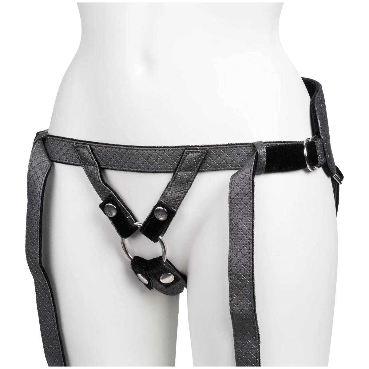 Het harnas is gemaakt van designer veganistisch leer (PVC) met een glanzend grijs oppervlak met patroon, en een zachte, zwarte polyester voering. Deze voelt heerlijk aan op de huid en voorkomt dat de bandjes wegglijden. Het heeft bovendien een brede onderrugsteun voor extra comfort. En de bandjes rond de heupen en dijen zijn volledig verstelbaar. Het open kruismodel geeft tijdens het spelen volledige toegang tot de intieme zone van de drager.