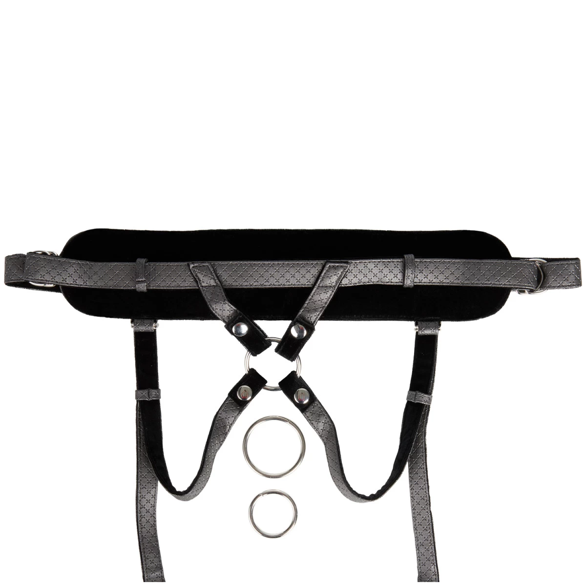 Inbegrepen zijn 3 metalen O-ringen in verschillende maten, die zijn bevestigd met drukknopen. Zo kun je ook je eigen O-ringen gebruiken met het harnas.