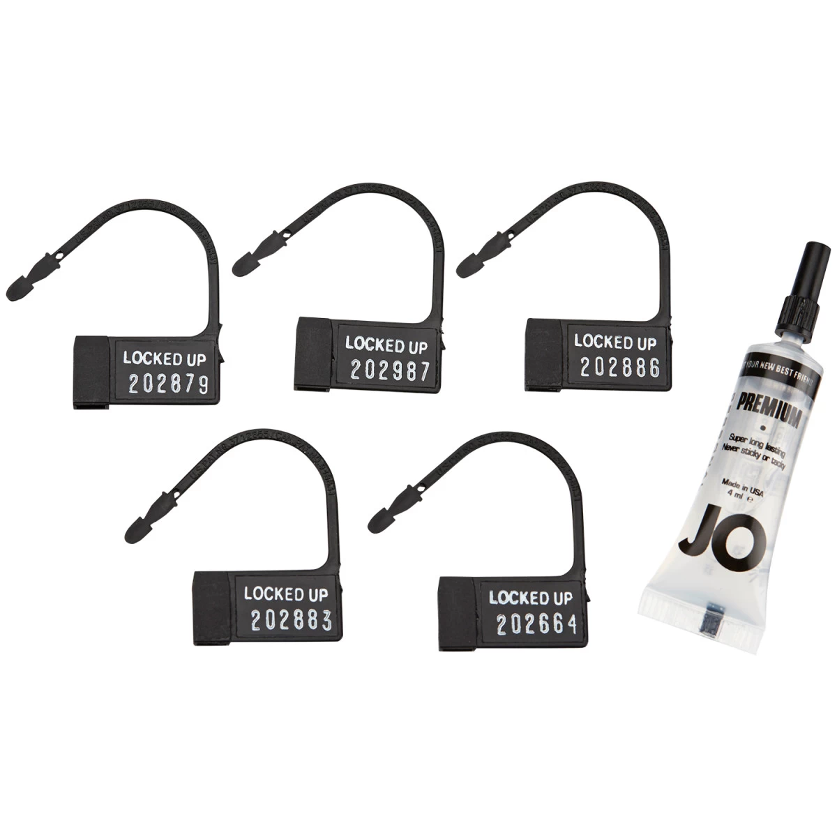 Inhoud: Peniskooi, 5 ringen in verschillende maten (+ 1 bovenring), 4 tussenstukken en borgpennen in verschillende maten, metalen hangslot met sleutel, 5 kunststof sloten met individuele nummers, opbergzakje.