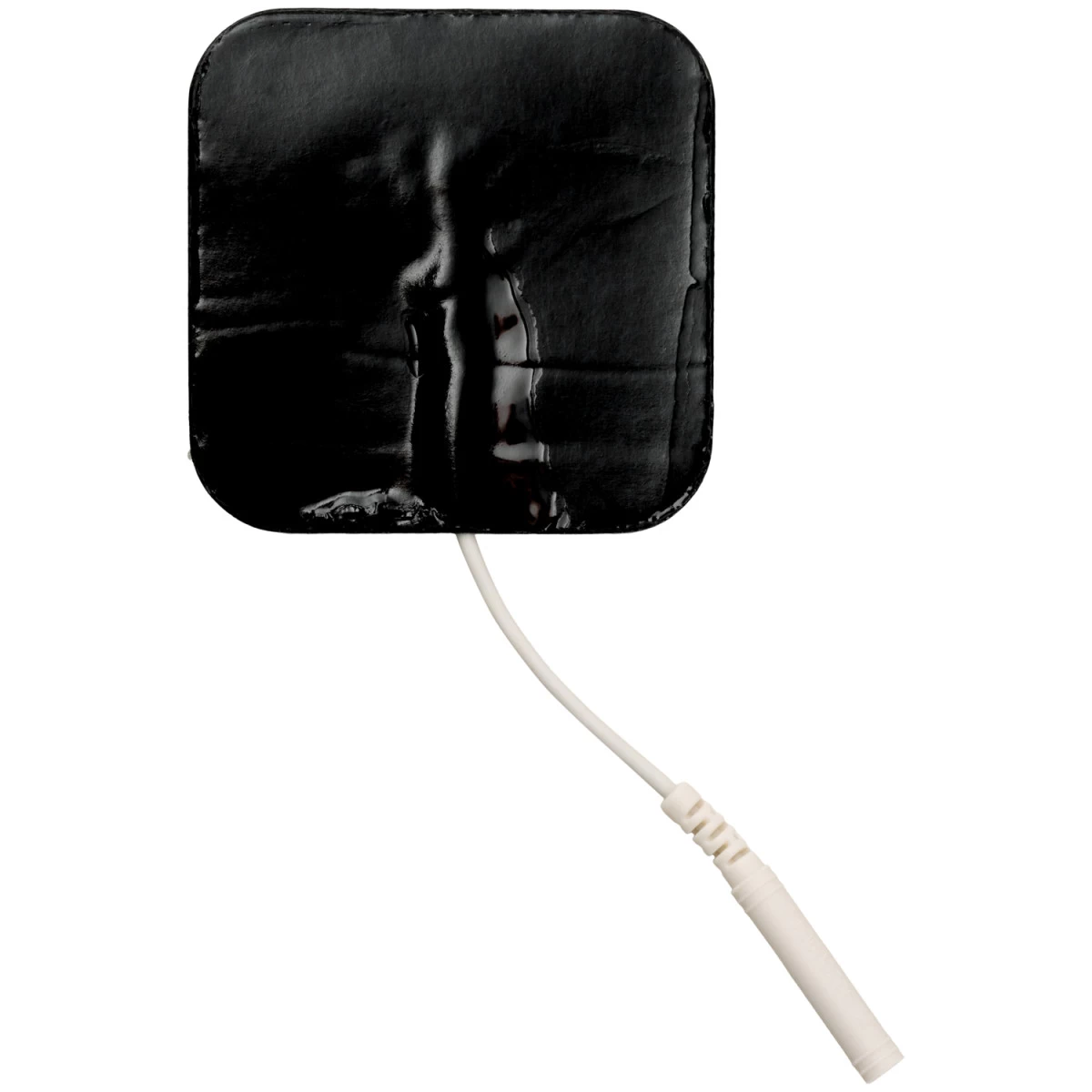 De vier vierkanten zijn veelzijdige e-stim-elektroden die kunnen worden hergebruikt en op maat kunnen worden geknipt – zolang je de centrale geleidingsdraad niet doorknipt. De pads hebben een aansluiting van 2 mm en zijn monopolaire elektroden. Dit betekent dat je er twee nodig hebt om een circuit te vormen.