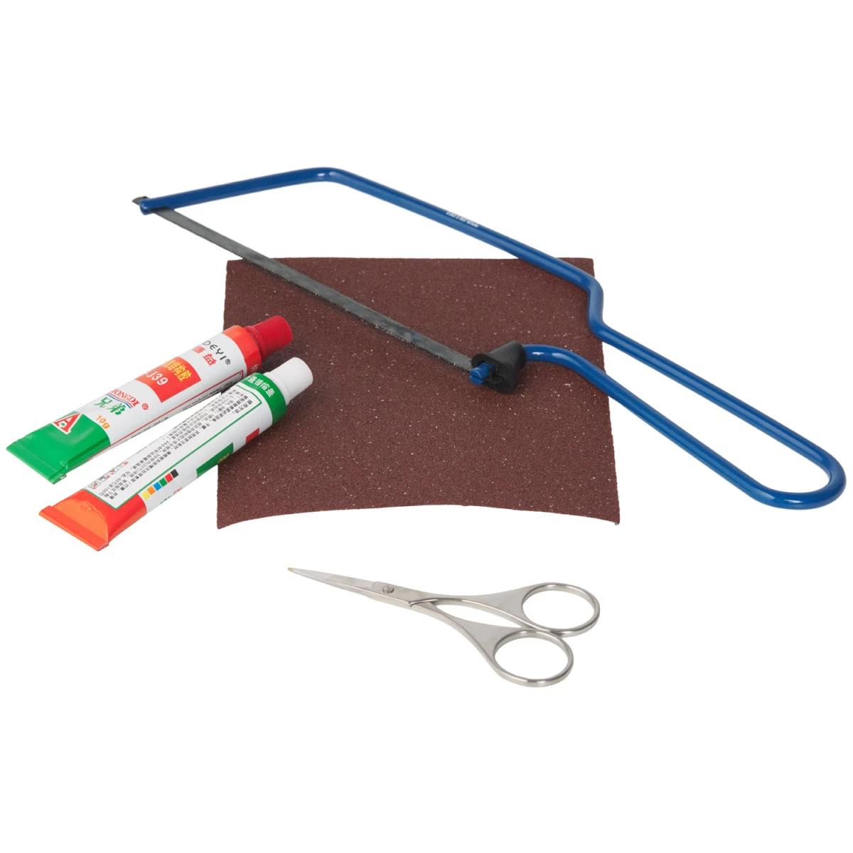 INHOUD: Drie sleeves in verschillende maten, cilinder met accessoires, zaag, schaar, schuurpapier en lijm.