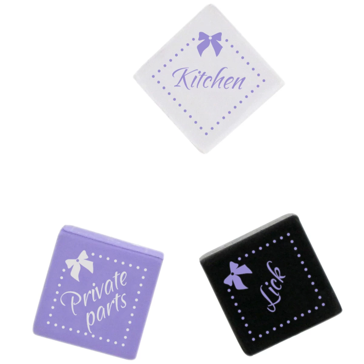 De paarse dobbelsteen laat zien op welk lichaamsdeel je de challenge moet doen. De zwarte vertelt je wat je moet doen, bijvoorbeeld masseren, zoenen of kietelen. De witte toont op welke locatie gespeeld moet worden, bijvoorbeeld de keuken, woonkamer of slaapkamer.