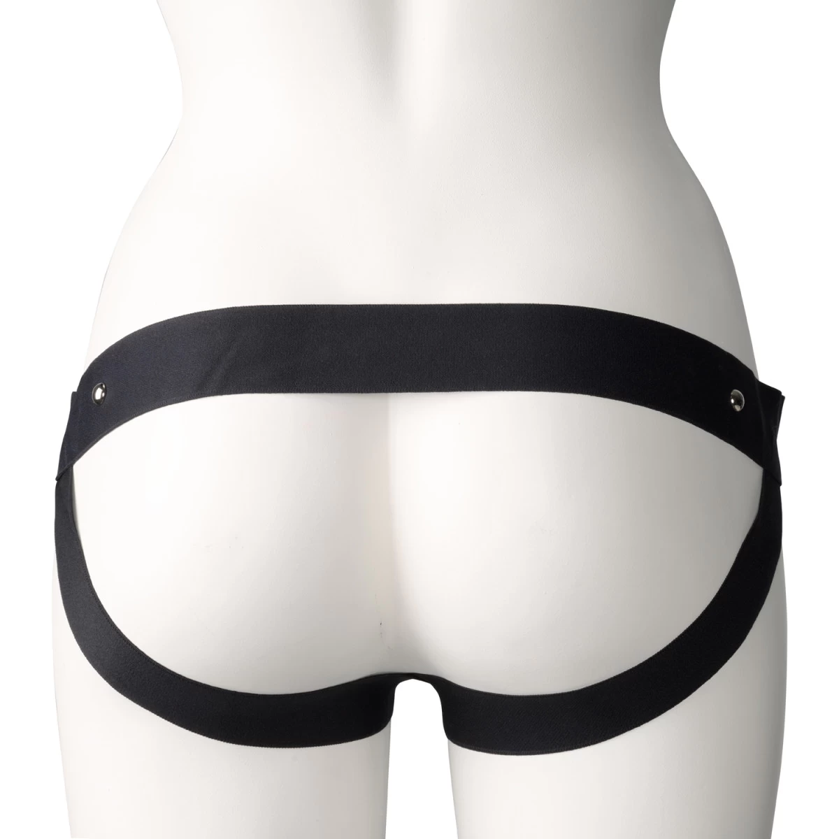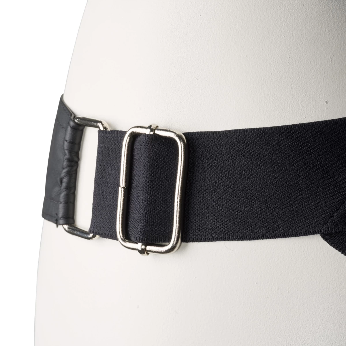 De brede, verstelbare banden spannen zich om je heupen en zilveren, metalen gespen en studs voegen erotiek toe aan de zwarte kunstleren jockstrap. De ring aan de voorkant omarmt je lid, zodat het vrij en bloot te bewonderen is, terwijl aan de achterzijde je billen verleidelijk lonken.