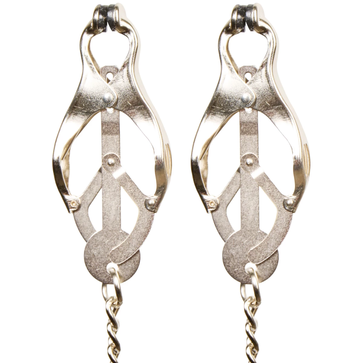 Geniet van het gevoel van harde, onverbiddelijke druk op je tepels als je deze elegante klemmen draagt. De metalen versieringen zien er verbluffend erotisch uit tegen de naakte huid, met je heerlijk gemartelde tepels die de hangers bekronen.