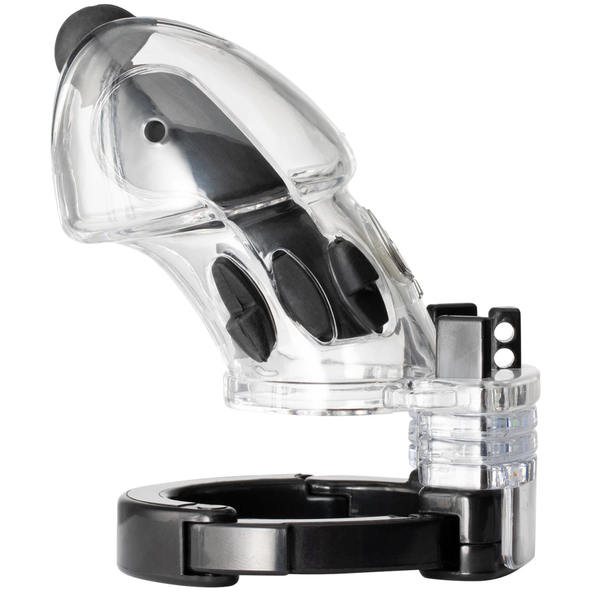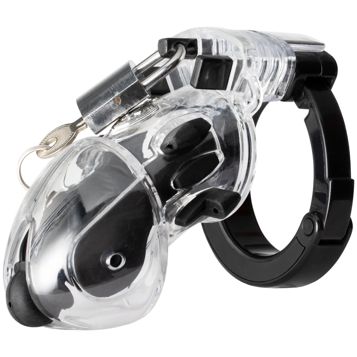 Om de kuisheidskooi om te doen, raden wij je aan om te beginnen met het aanbrengen van een kleine hoeveelheid glijmiddel op je penis (in een ontspannen toestand bevindt). Open daarna het zwarte, verstelbare rugstuk en plaats het rond de peniswortel bij het scrotum. Sluit het achterstuk totdat je de omtrek vindt die het beste past, en plaats het transparante sluitstuk, terwijl de zwarte punt naar binnen wijst. Dit vergrendelt de omtrek van het achterstuk. Plaats de peniskooi vervolgens om de penis en sluit deze af met het meegeleverde metalen hangslot. Je kunt de afstand tussen het rugstuk en de peniskooi aanpassen met de drie afstandhouders, voor de best mogelijke pasvorm.