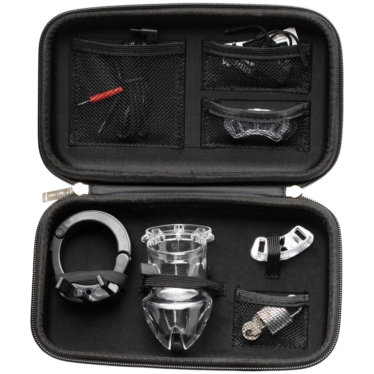 BEVAT: 1 peniskooi, 1 verstelbaar rugstuk, 1 slotstuk, 3 afstandhouders, 10 naamplaatjes, 1 metalen hangslot met twee sleutels, 5 plastic hangsloten voor eenmalig gebruik, 2 glijmiddel monsters, 1 instructieboek, 1 opbergdoos.