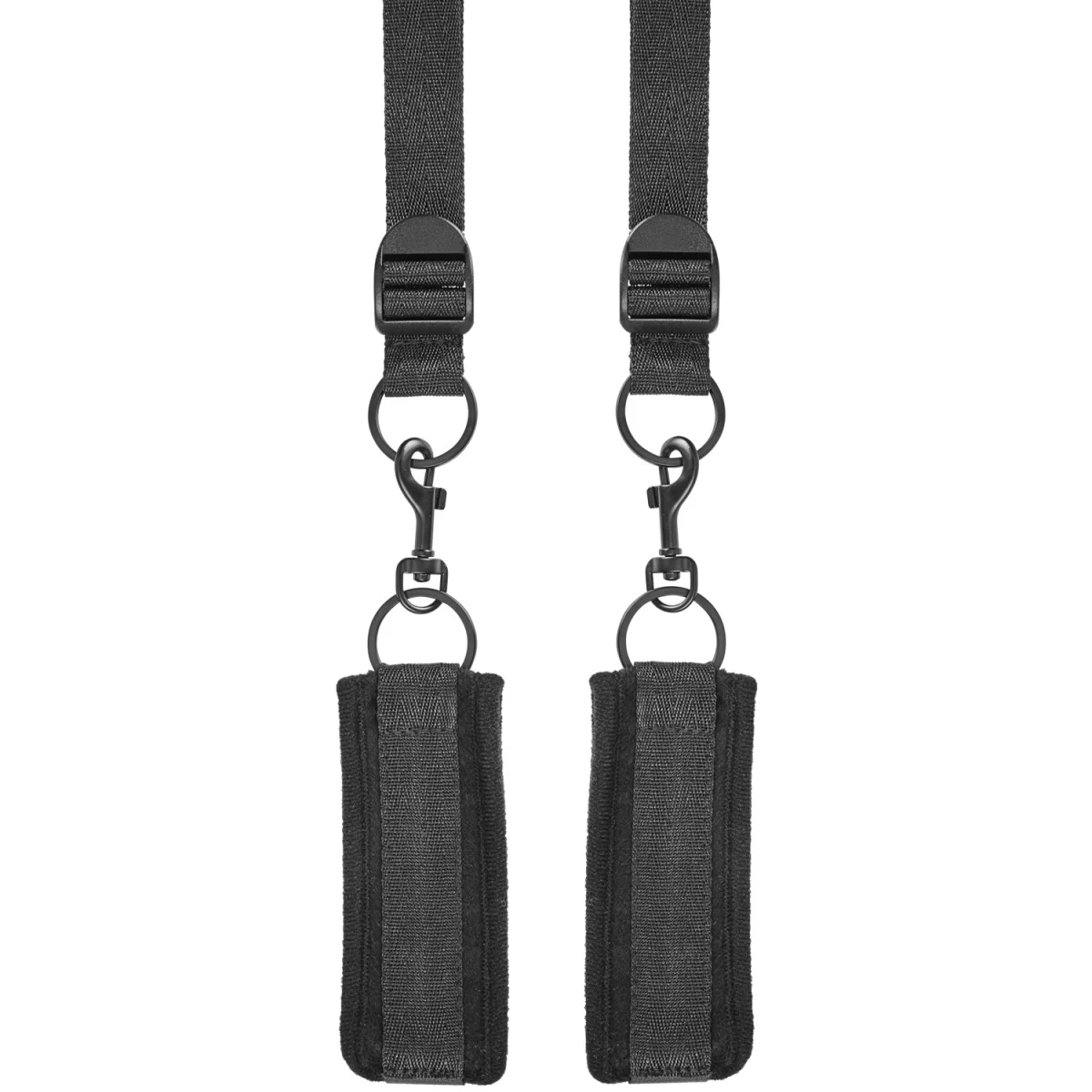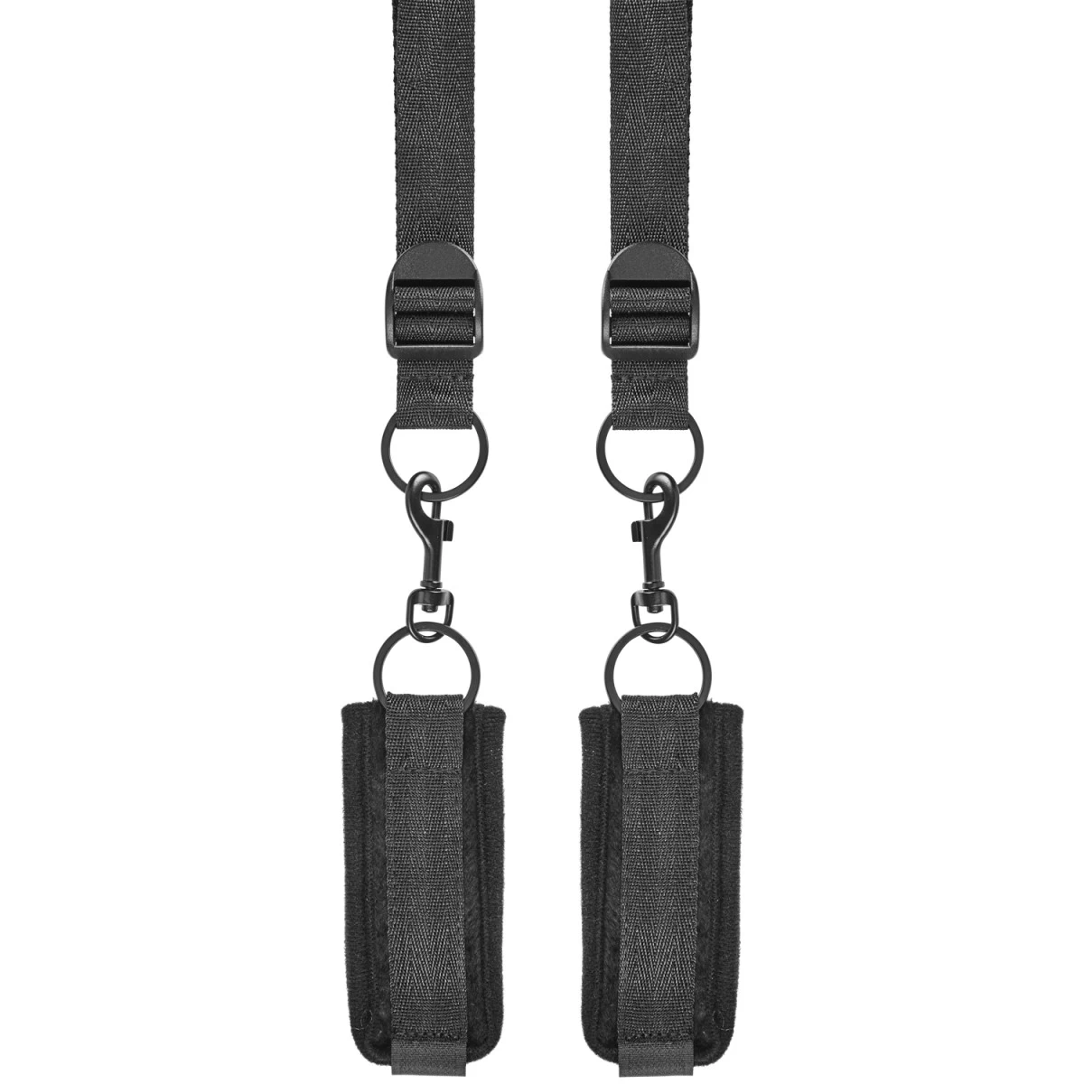 Schuif de banden onder de matras zodat de hand- en enkelboeien aan beide uiteinden of zijkanten uitsteken; afhankelijk van hoe wijd je de ledematen van je partner wilt spreiden. Bevestig de zachte boeien om de polsen en enkels van je partner, en vervolgens aan de bedriemen met de karabijnhaken.