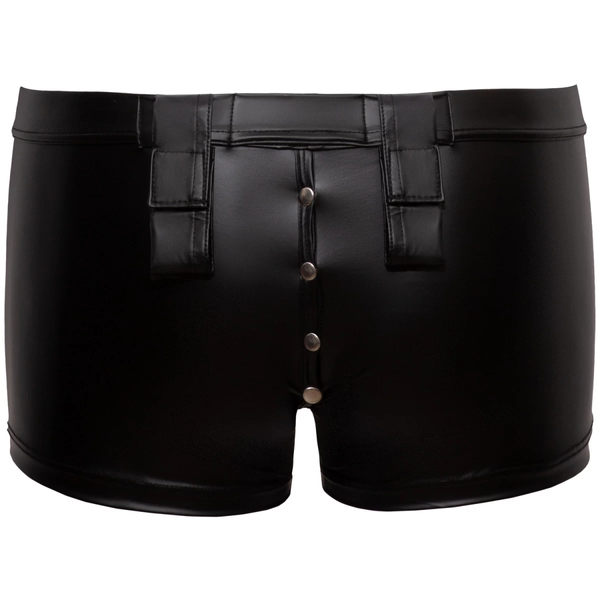 De zwarte wetlook boxers hebben een matte uitstraling en hebben drukknopen die een rechte lijn over zowel de billen als de bobbel vormen. Ze zijn nauwsluitend maar rekbaar voor je comfort tijdens het spelen.