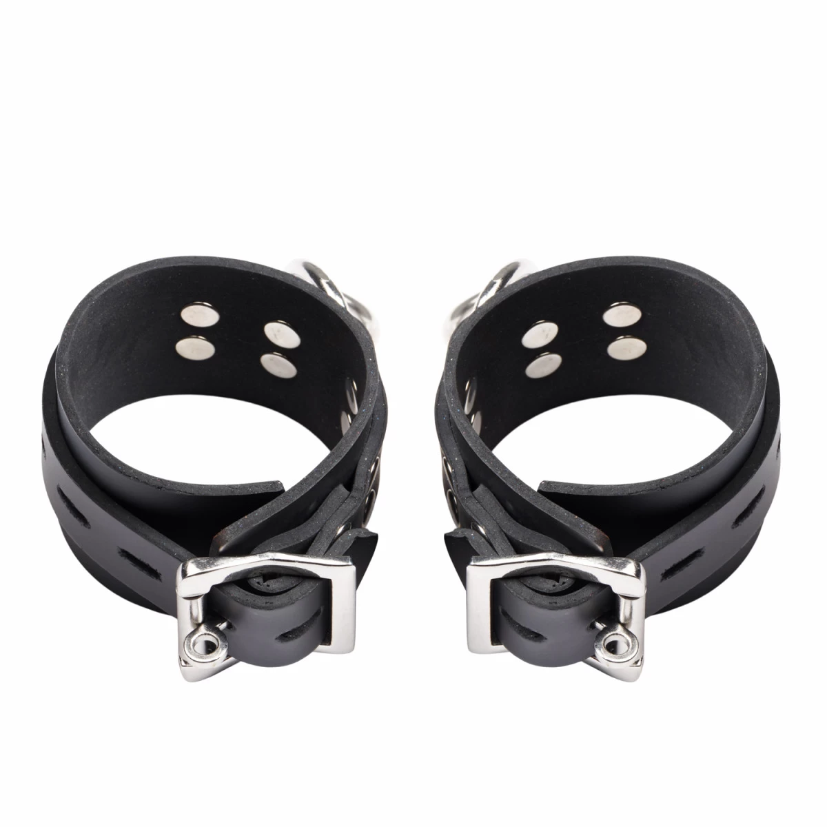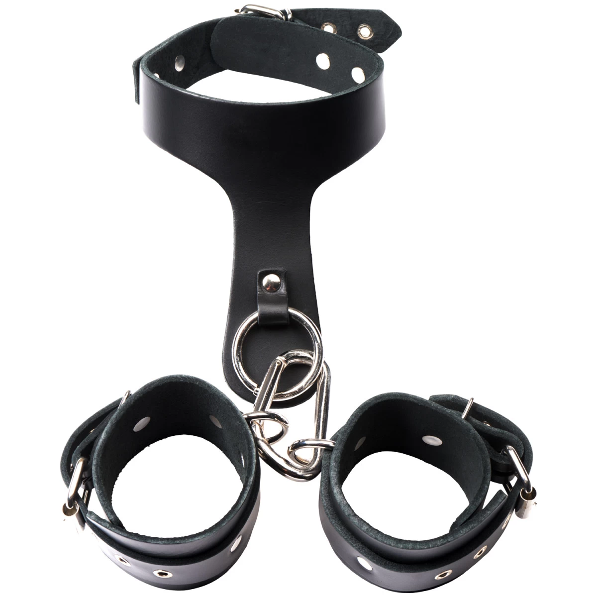Gebruik de gespsluitingen op de kinky leren handboeien en halsband om je in bedwang te houden of verbind de twee met de sluiting om je kronkelende sub nog minder bewegingsruimte te geven. Gebruik de O en D-ringen om te beperken hoe je wilt, of lijn (niet inbegrepen) je lover aan, zodat deze niet van je zijde wijkt.
