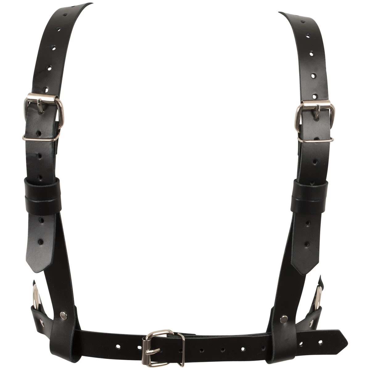 Omlijst de bovenkant van je borst met meerdere bandjes die elkaar kruisen in een decoratief patroon, terwijl langere bandjes over de borsten lopen om met de beha-lijn samen te komen. De bandjes zijn versierd met studs en sluiten op de rug met gespen.