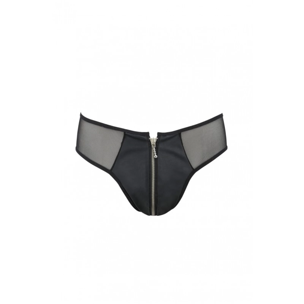 Het rekbare materiaal biedt een comfortabele pasvorm met een uitsparing aan de voorkant die ruimte biedt voor je lid. Transparant mesh rust op je heupen, terwijl het middelpunt wordt bedekt met zwarte stof. Verras je partner met deze spannende slip en ontdek of ze de verleiding kunnen weerstaan om van de rits af te blijven.