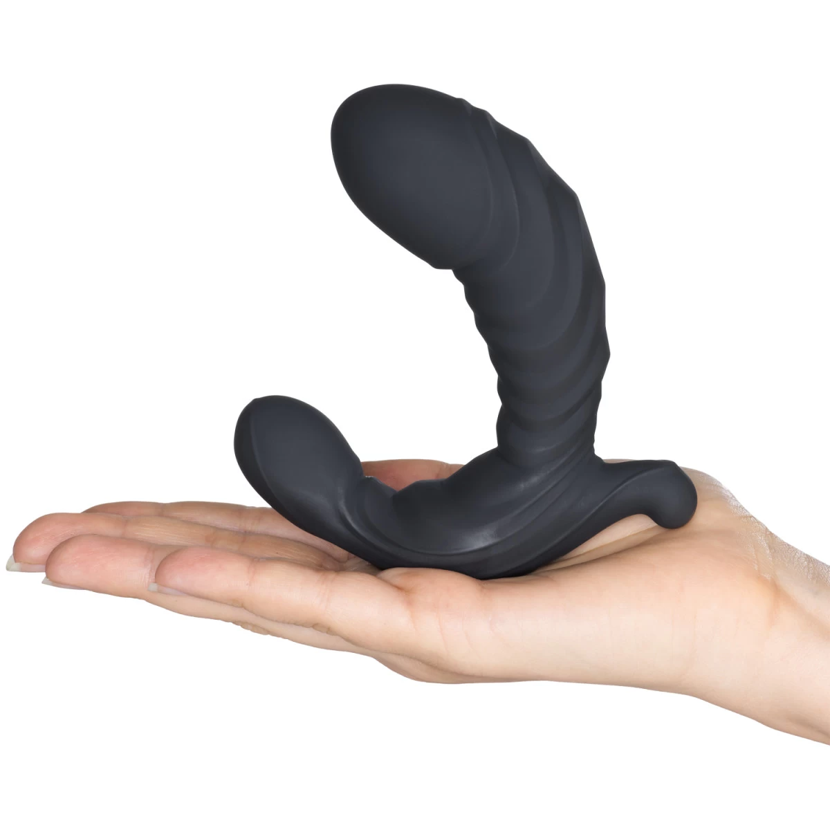 De vibrator bestaat uit een opblaasbare, gebogen schacht met een stimulerende textuur en een gebogen uitwendig deel dat het perineum of de clitoris kan stimuleren, afhankelijk van of je hem vaginaal of anaal gebruikt. De vorm is perfect voor het raken van de G-spot of de prostaat.