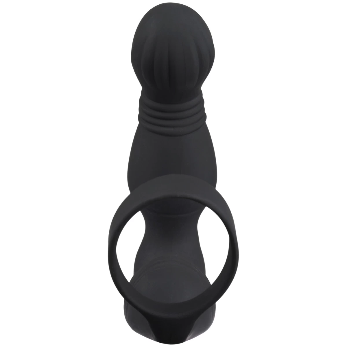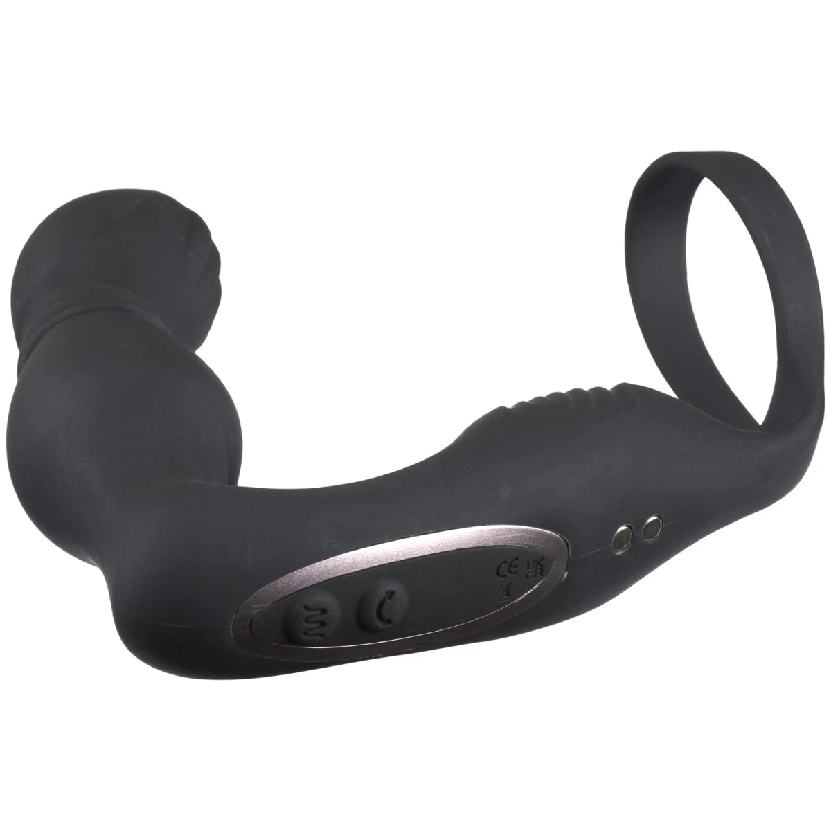 Plaats de cockring op de basis van je penis en schuif de gebogen schacht met dubbelen bollen in je anale opening. Je voelt de trillingen op de gegroefde basis, zodat hij je perineum plaagt en de vibraties de wortel van je penis bereiken.