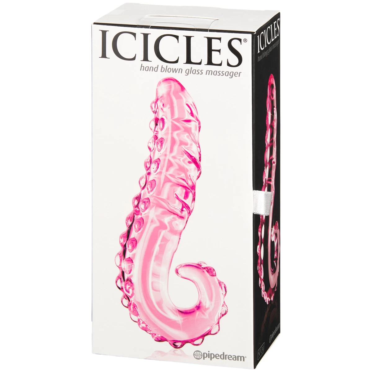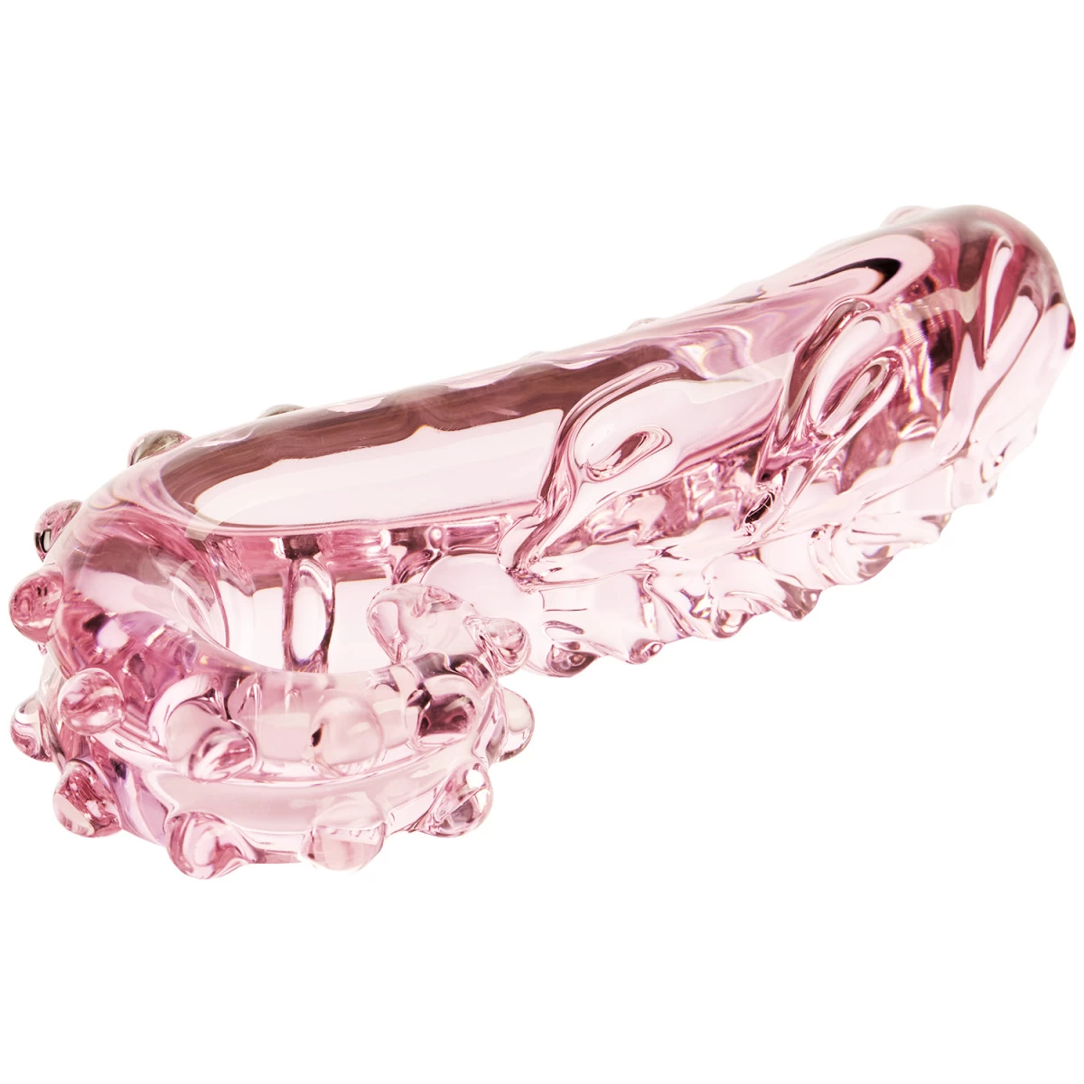 Icicles nr. 24 roze glazen dildo heeft aan de ene kant stimulerende noppen en aan de andere kant ribbels die op aderen lijken en die stimuleren als de dildo wordt ingebracht.