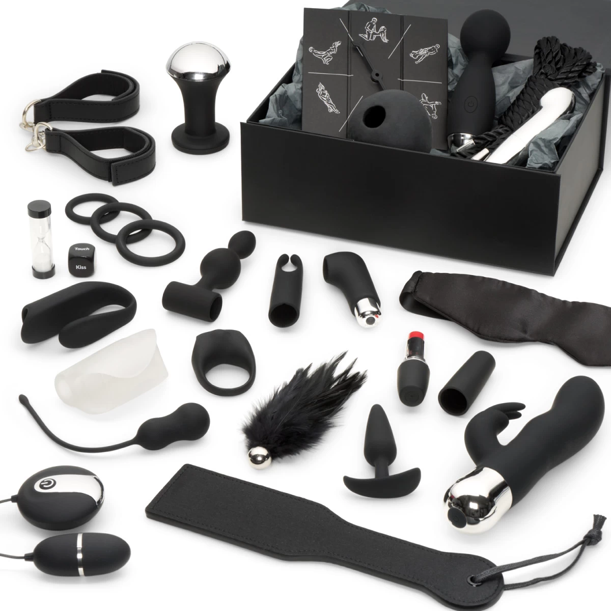 Plaag en behaag met de vele speeltjes en verken nog meer sensaties met de blinddoek, boeien en het bondagetouw. Wacht in ademloze spanning, terwijl je partner besluit of je met zachte strelingen van de veren kietelaar, hardere klappen van de paddle of een hemelse massage met de massager hebt verdiend.