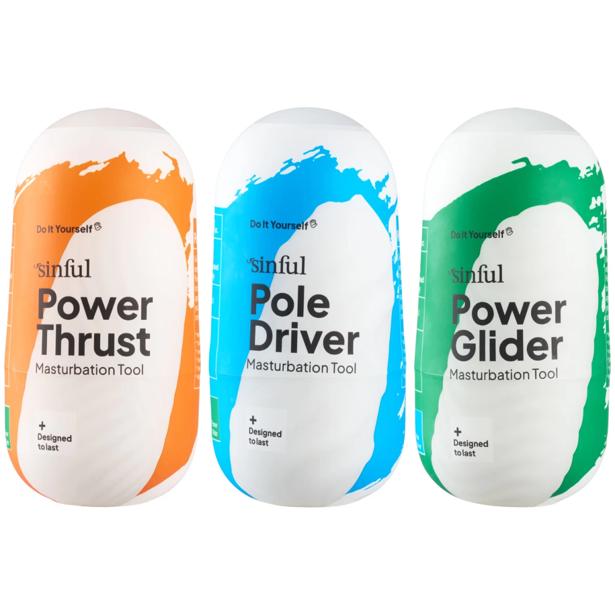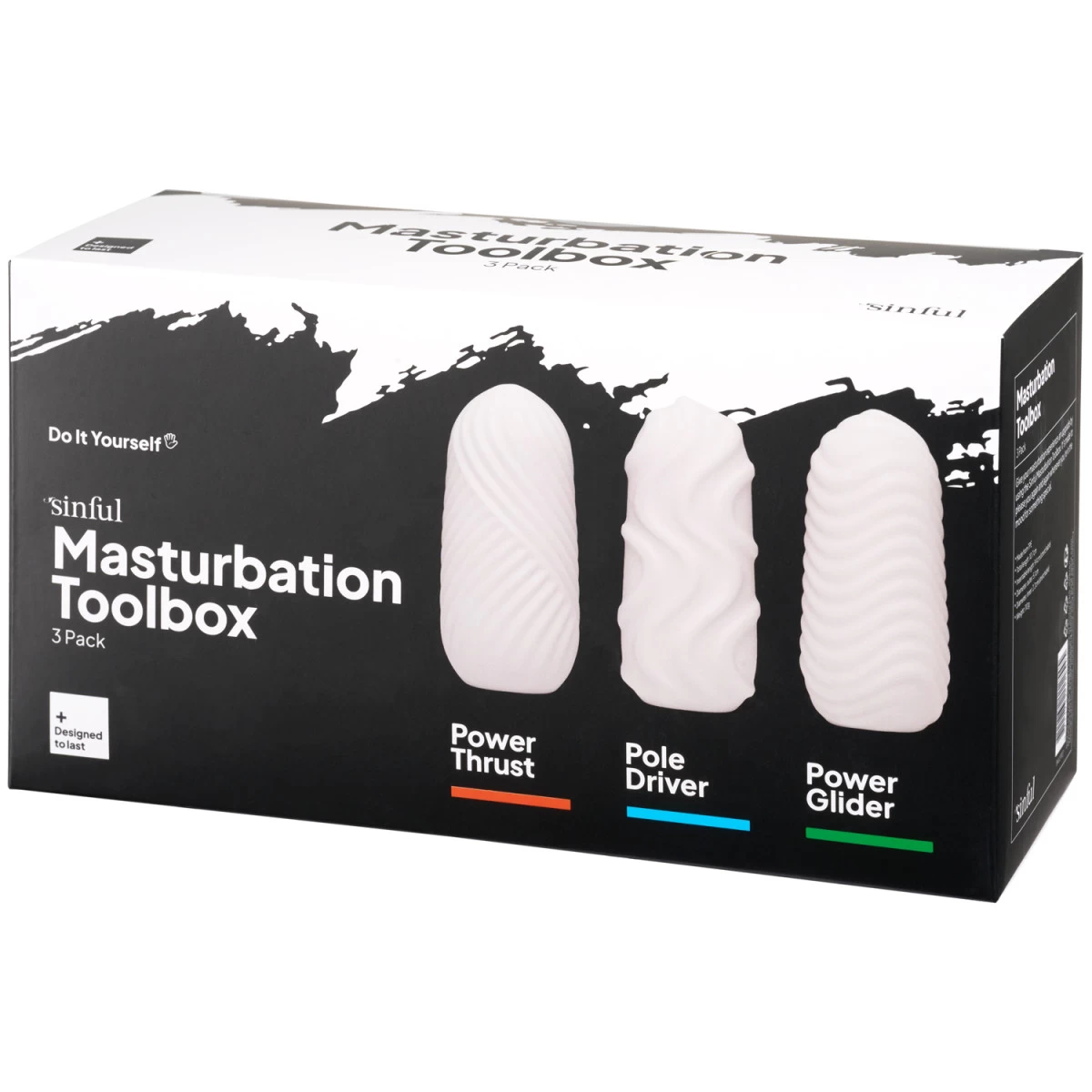 Grijp de Masturbator Toolbox van Sinful en maak je genotscollectie compleet met drie stimulerende maatjes. Elk ei barst open en onthuld een zachte, getextureerde sleeve, die een heerlijke draai geeft aan je vertrouwde handjob.