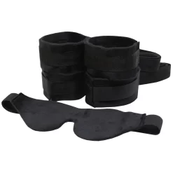 De set bestaat uit een zachte blinddoek en 4 zachte boeien, die zowel om de polsen als de enkels kunnen worden gebruikt. Aan het einde van elke boei zit een riem waarmee je handen en voeten aan elkaar kunt binden of stevig aan het bed kunt binden.