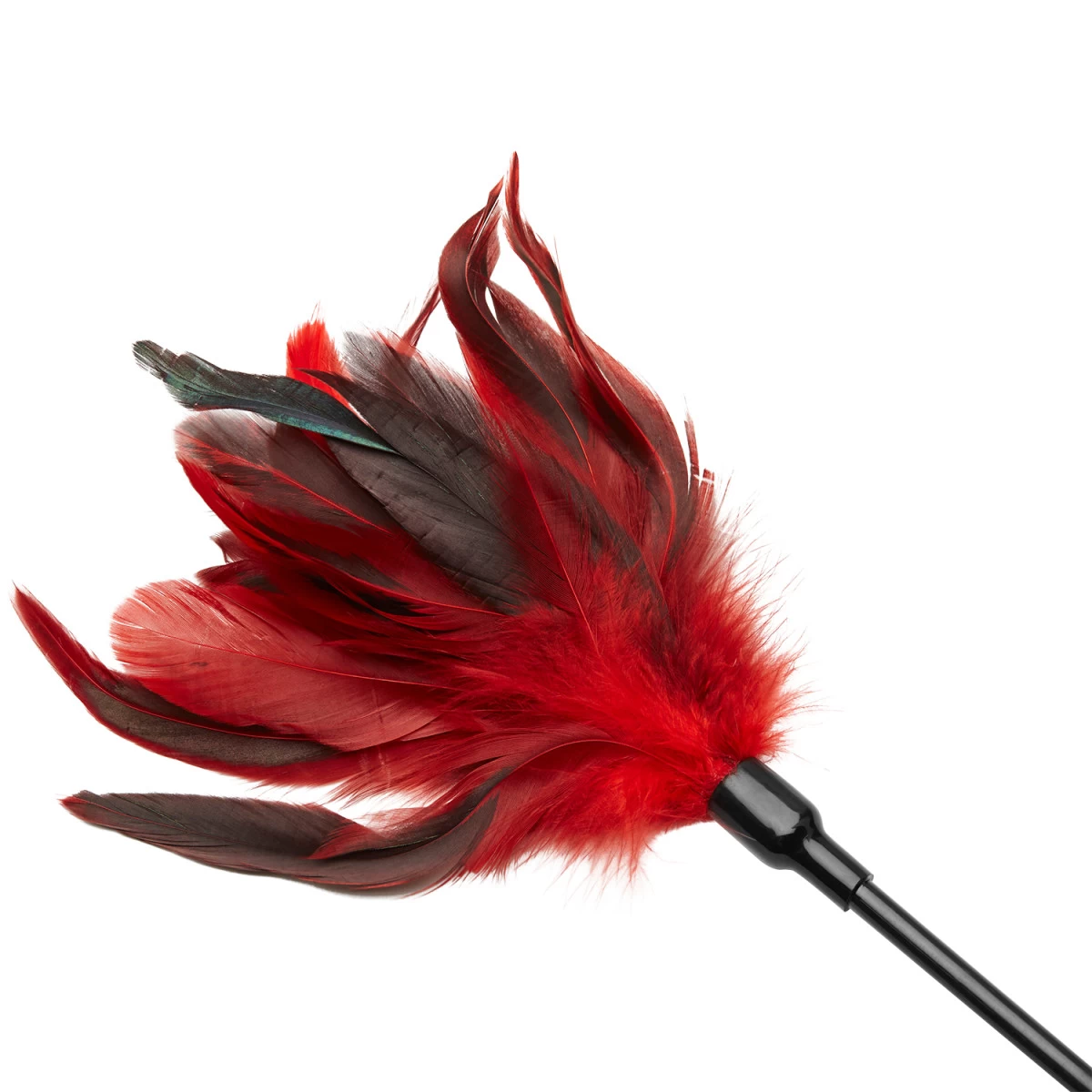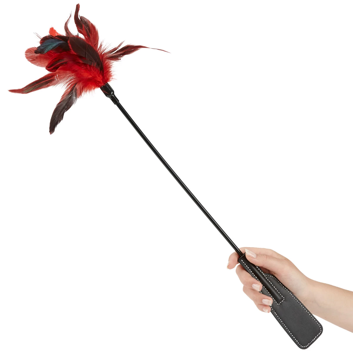 Aan het ene uiteinde zit een peddelzweep en aan het andere uiteinde is een mooie rode veer bevestigd. Zo combineer je de spannende klappen van de zweep met de zinnenprikkelende streken van de veer.