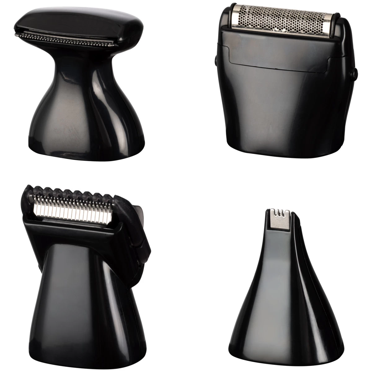 INBEGREPEN: Houder voor scheerapparaat en opzetstukken, batterijen, opbergtas en borstel voor het verwijderen van geschoren haar.