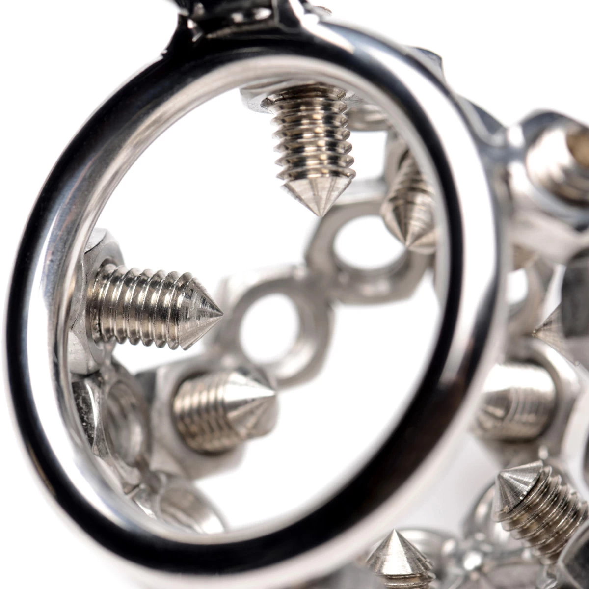 Deze ultra kinky kuisheidskooi is versierd met bouten en moeren met puntige uiteinden. Pas de bouten aan zoals jij het wil, afhankelijk van hoe strak en pijnlijk je de ervaring wil hebben.