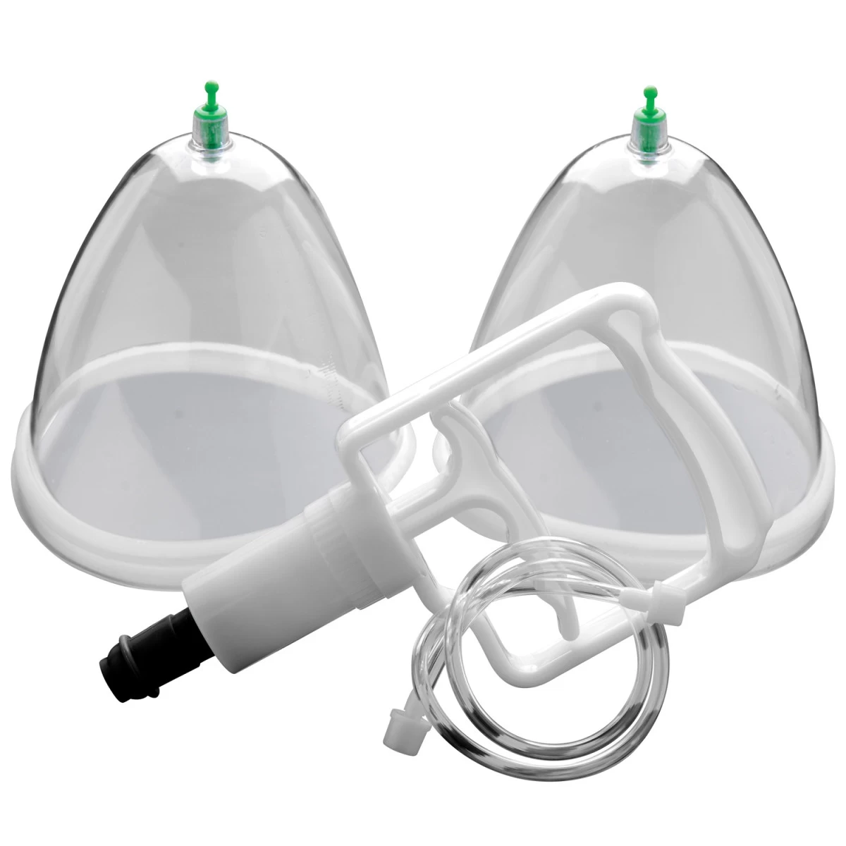De set bestaat uit twee cups die met een praktische pistoolgreep afzonderlijk op de handpomp zijn aangesloten.