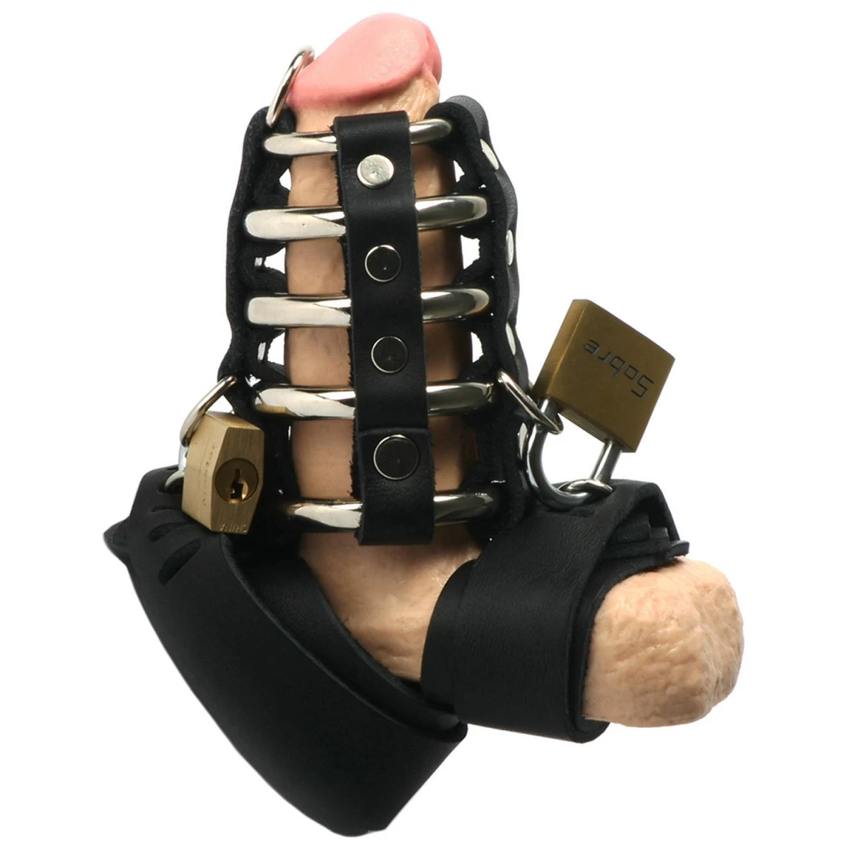 Schuif de penis in de kooi en gebruik de eerste leren riem om rondom de basis van de penis en ballen te wikkelen. De tweede riem wordt rond de balzak vastgemaakt, waardoor deze strakker wordt gespannen en verzwaard. Gebruik hangsloten (niet meegeleverd) om de riemen aan de kooi vast te maken en te vergrendelen voor een doeltreffende beveiliging.