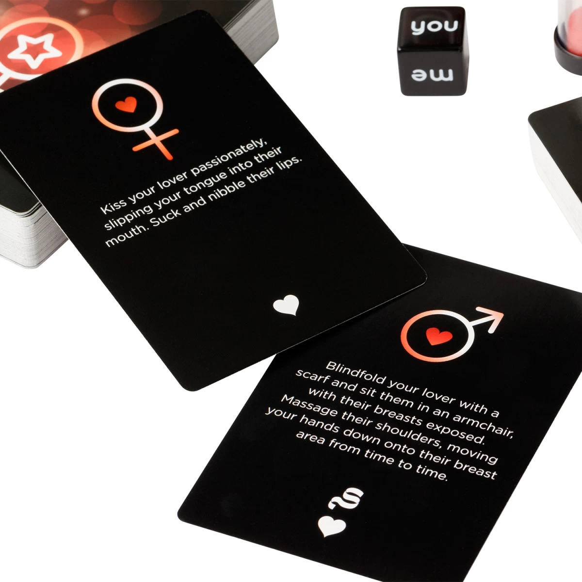 Het spel bevat: 90 kaarten (gesplitst in “his” en “hers”), een zandloper en een dobbelsteen met daarop “me”, “you” of “vraagteken”. De dobbelstenen bepalen welke kaart wordt getrokken en wie de instructies van de kaart geeft of ontvangt.